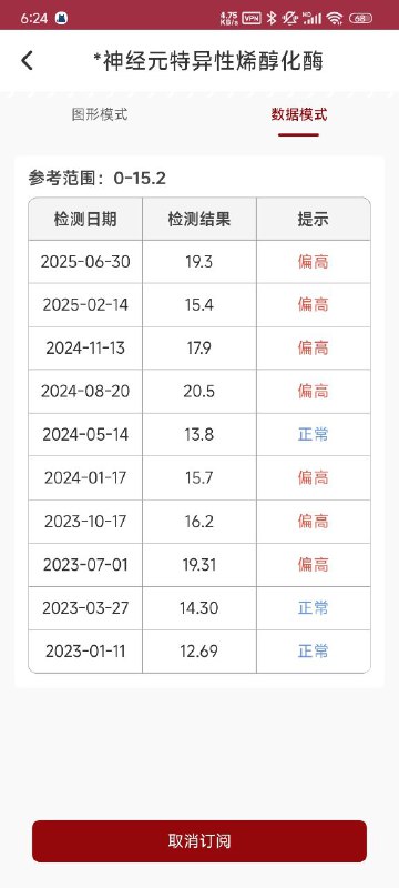 A *神经元特异性烯醇化酶 图形模式 数据模式 参考范围:0-15.2 检测日期 检测结果 提示 2025-06-30 19.3 偏高 2025-02-14 15.4 偏高 2024-11-13 179 偏高 2024-08-20 20.5 偏高 2024-05-14 13.8 2024-01-17 15.7 偏高 2023-10-17 16.2 偏高 2023-07-01 19.31 偏高 2023-03-27 14.30 正常 2023-01-11 12.69 正常