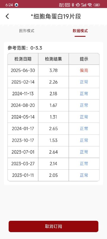 A *细胞角蛋白19片段 图形模式 数据模式 参考范围:0-3.3 检测日期 检测结果 提示 2025-06-30 3.78 偏高 2025-02-14 2.26 2024-11-13 2.18 2024-08-20 1.67 2024-05-14 1.31 正常 2024-01-17 2.65 2023-10-17 1.53 正常 2023-07-01 2.64 2023-03-27 2.14 正常 2023-01-11 2.05 日